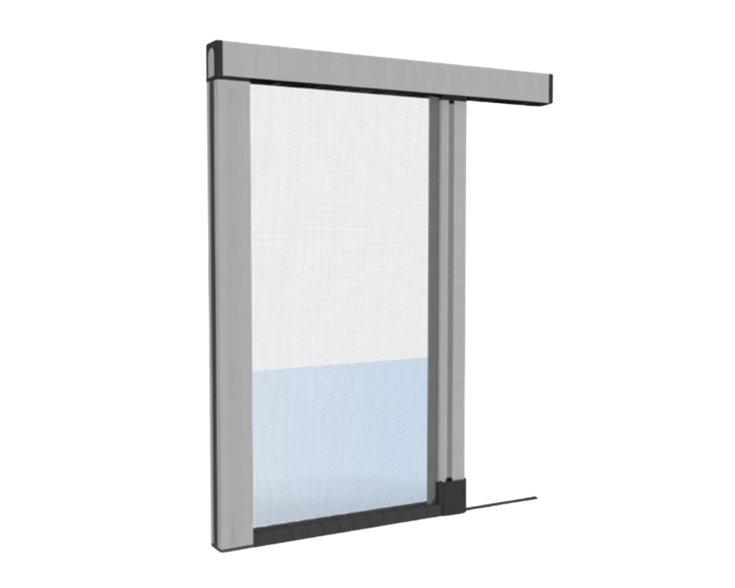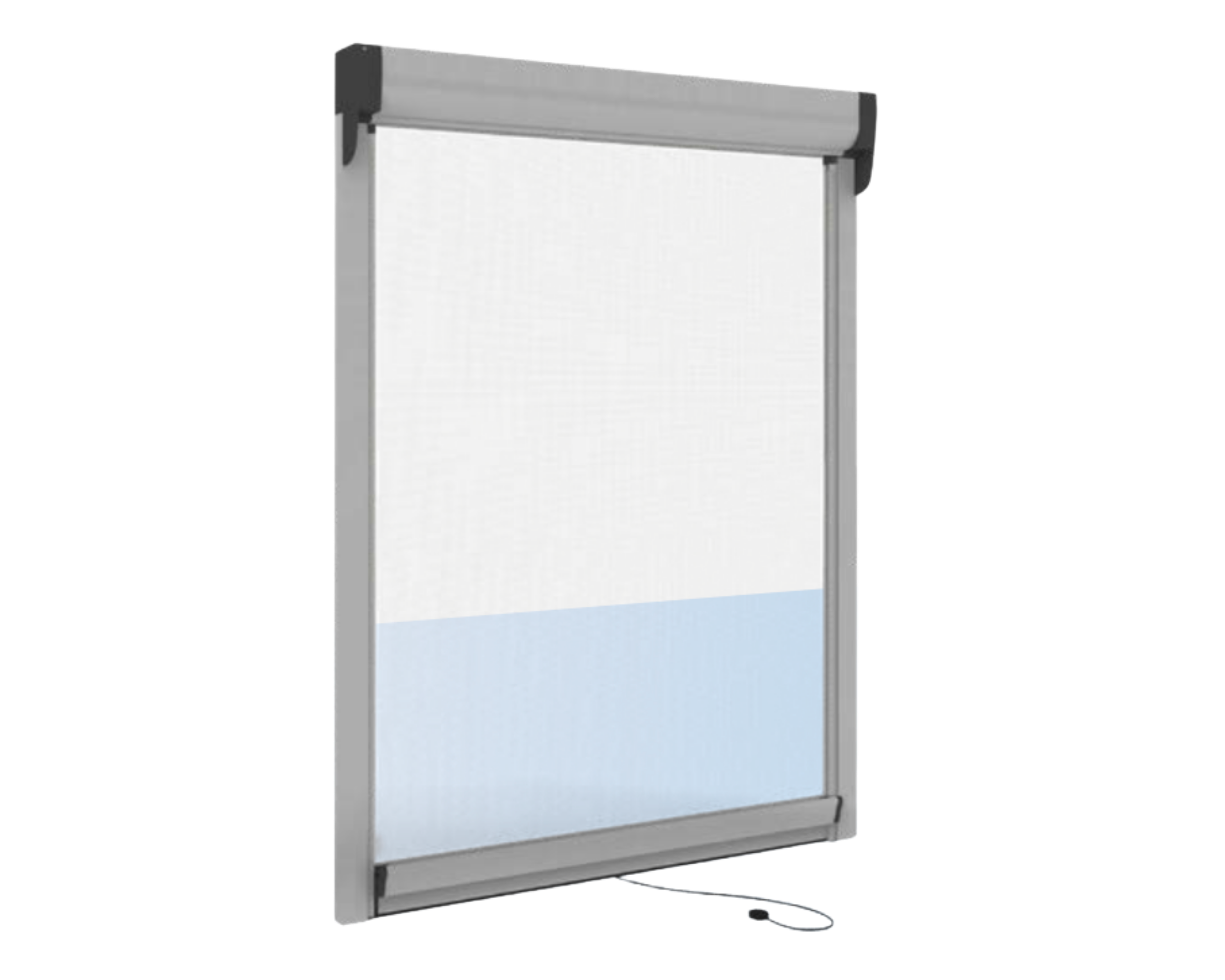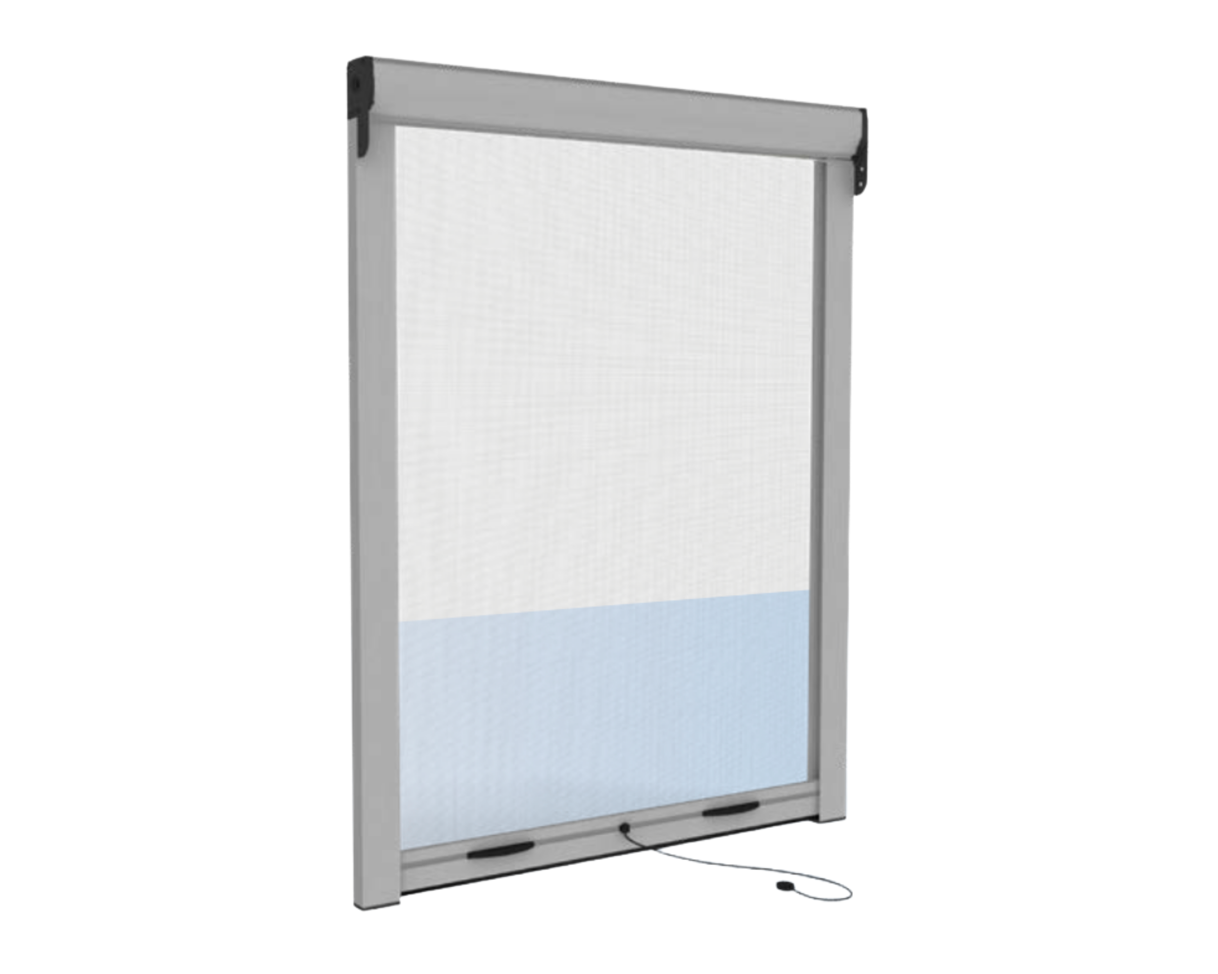 Zanzariera telescopica a molla ad avvolgimento verticale con bottonia bordo rete e sistema di azionamento Press Up